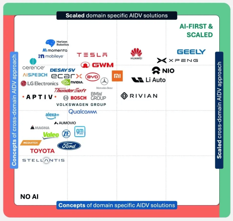 This matrix shows where each automaker stands. The further top-right, the more AI controls the car. Bottom-left means AI is just a feature.