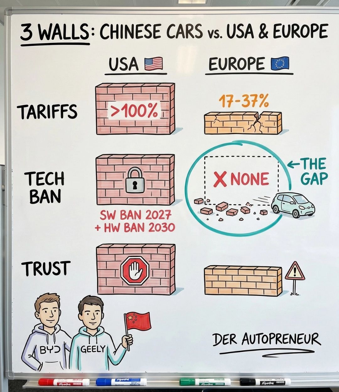 And even if walls 1 and 2 fall, no American knows BYD. No dealer sells their cars. No mechanic can fix them. Chinese manufacturers would need years to establish themselves. Just like we're seeing in Europe right now.