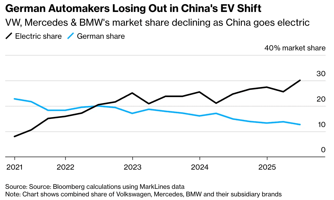 Volkswagen, Mercedes, and BMW have lost about half their China market share since 2021.